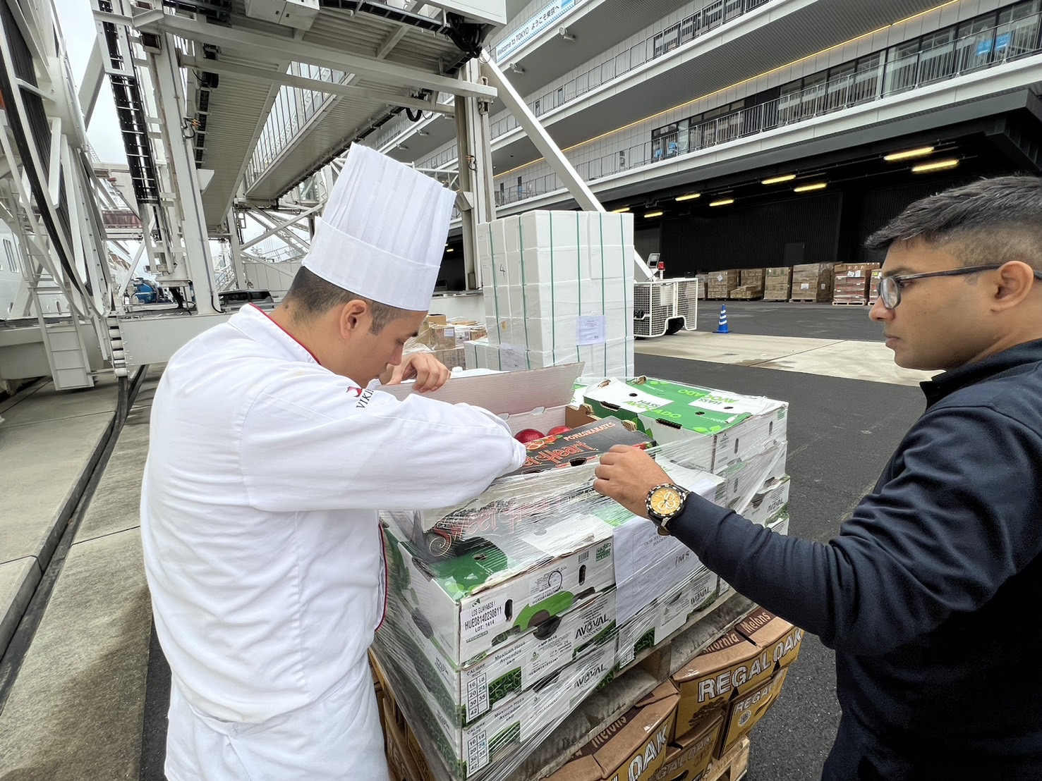 食品: 野菜、果物、肉類(和牛、冷凍食品等)、卵・乳製品(チーズ、ヨーグルト、アイスクリーム等)、米(日本米、海外米)、魚介類(鮮魚、冷凍海鮮等)等 飲料: ミネラルウォーター、ソフトドリンク、酒類(ビール、ウィスキー等)、茶類(ティーバッグ、茶葉)、ミルク等 その他: 乾物(缶詰め、調味料、製菓材料等)、季節限定菓子(クリスマスチョコレート、お月見団子等)、観光特産品、消耗品等 。 健康用品、化粧品、旅行土産、ギフト品等船内販売の免税品を提供しております。